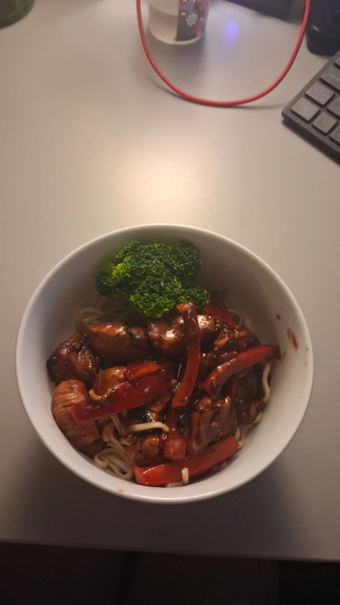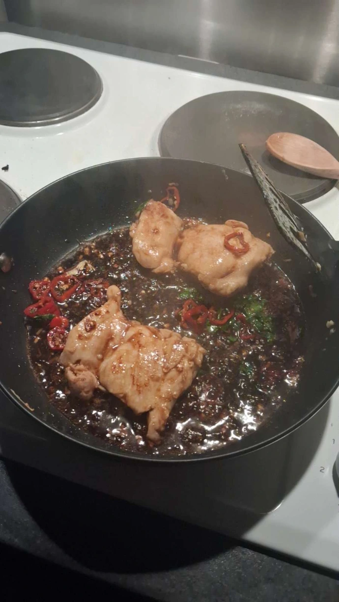 - Check to make sure chicken is thoroughly cooked before serving and then serve with your choice of veg and noodles.