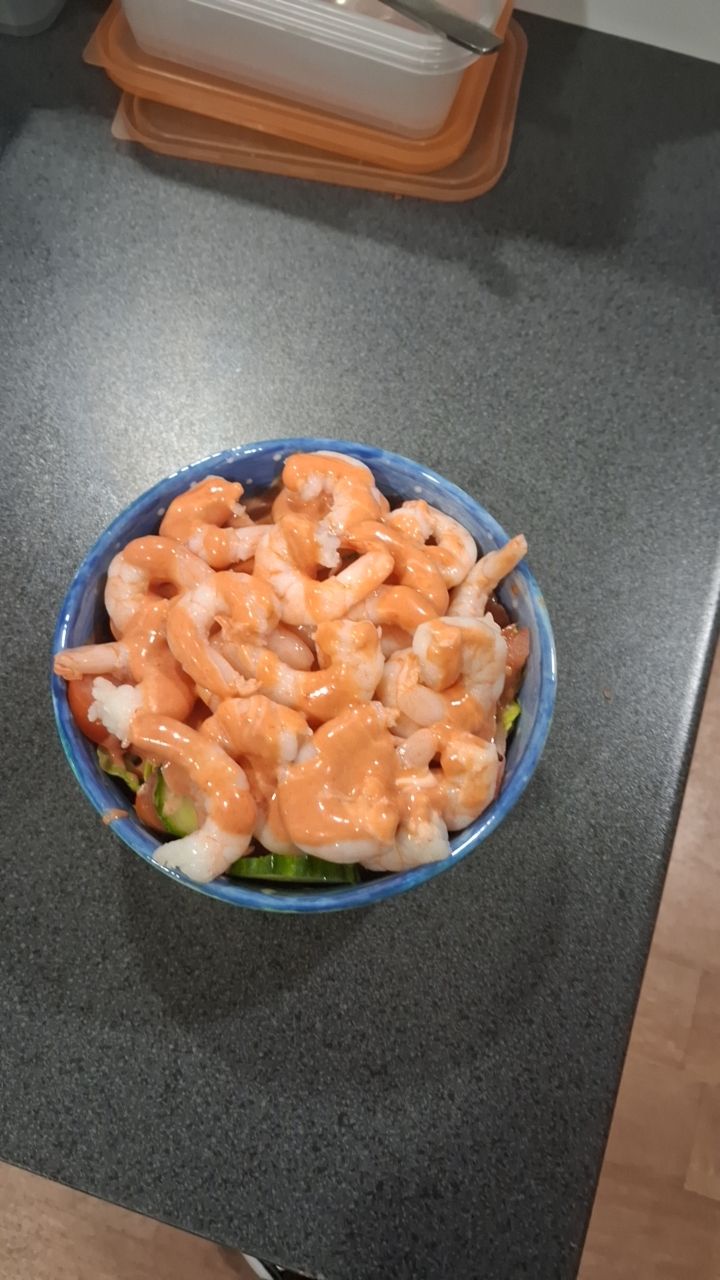 Place the lettuce then tomatoes the cucumber and finally the prawns in a bowl